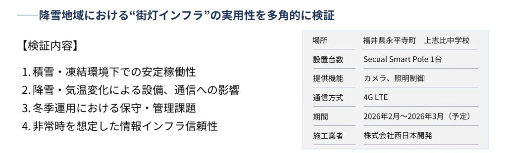 同プロジェクトの第1弾として、福井県永平寺町の協力のもと、上志比中学校において、既設の街灯をSmart Poleに交換し、登下校時の防犯強化と積雪や凍結を伴う環境下での検証を実施するという。