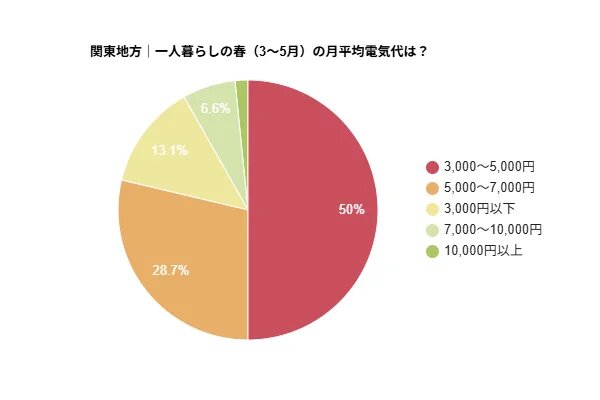 春の平均電気代を聞いたところ、「3,000~5,000円」と答えた人が50%で最も多く、次いで「5,000~7,000円」が28.7%と続いた。全体として比較的低い金額帯に回答が集まっており、春は暖房や冷房の使用が少なく、電気代が抑えられる傾向がうかがえる。
