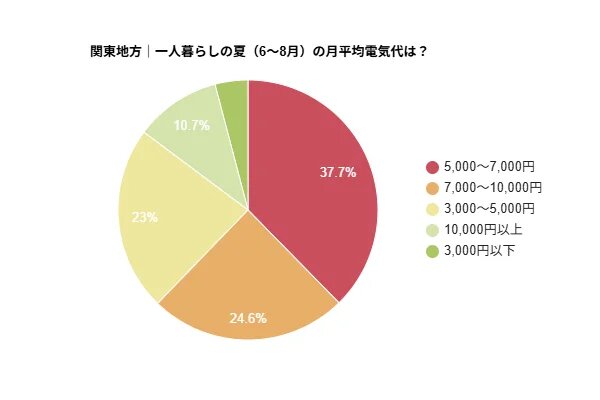 夏の平均電気代を聞いたところ、「5,000~7,000円」と答えた人が37.7%で最も多い結果に。また、「7,000~10,000円」が24.6%、「10,000円以上」が10%以上いることから、夏は冷房の影響で電気代が高くなりやすいことがうかがえる。