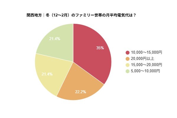 冬の電気代について、関西地方の3人以上のファミリー世帯では「10,000~15,000円」の世帯が35%で最も多い結果に。