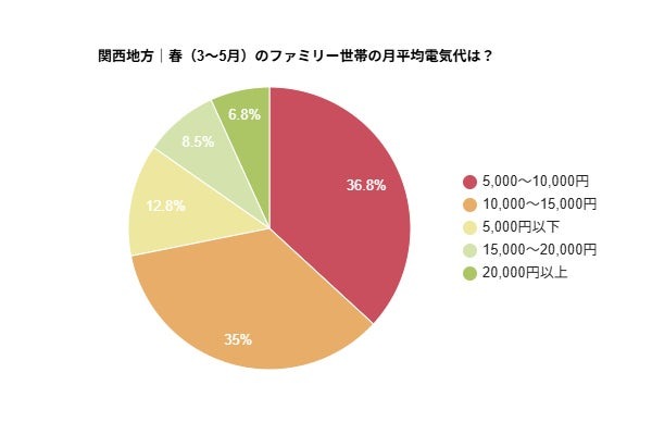 春の電気代について、関西地方の3人以上のファミリー世帯では「5,000~10,000円」「10,000~15,000円」がそれぞれ約3割強を占めた。
