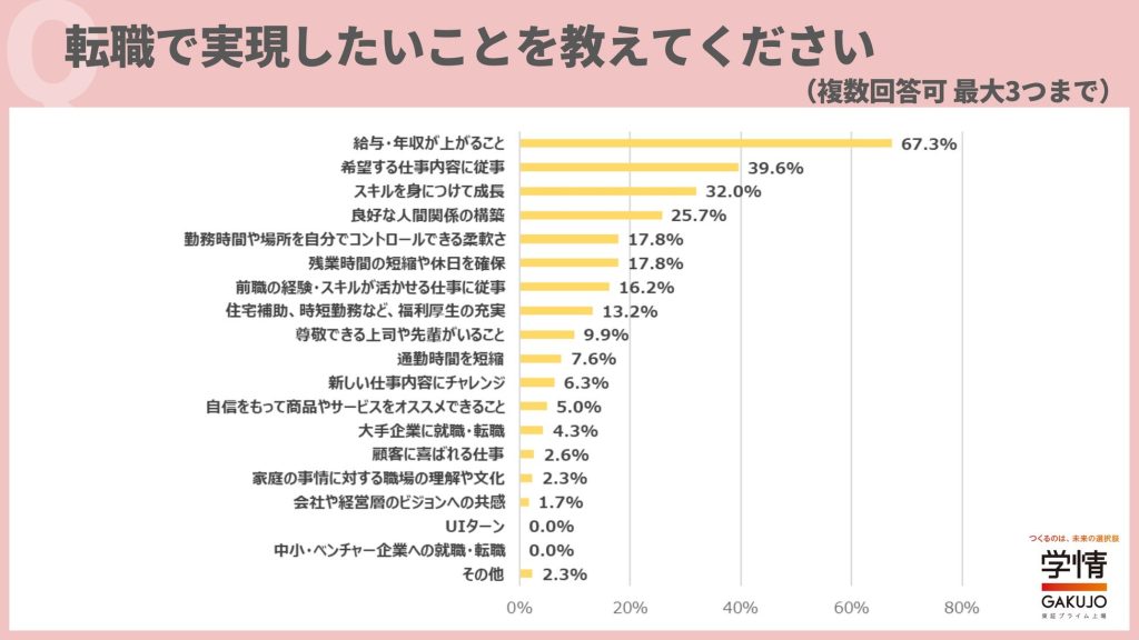 20代後半から30代の転職希望者が転職で実現したいこと(3つまで選択)は、「給与・年収が上がること」が67.3%で3人に2人に上り、給与アップは転職先選びの必須条件と言える結果に。
