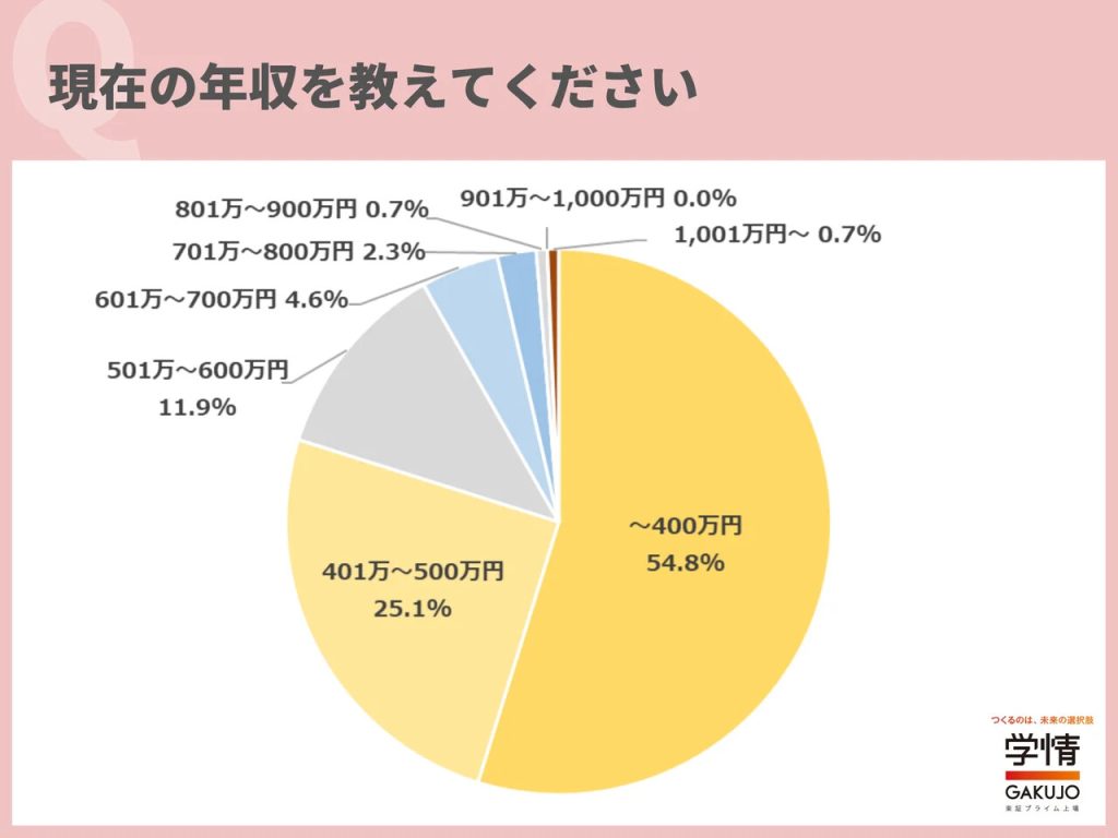 現在の年収については、「400万円以下」が54.8%で過半数を占めた。「401万~500万円」25.1%、「501万~600万円」11.9%が続き、「401万円以上」の合計は45.3%だった。