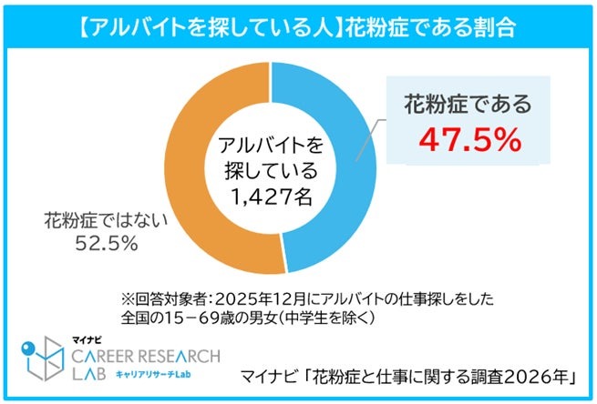 また、アルバイト探しをしている人でも「花粉症」の割合は47.5%で、約半数が「花粉症」を抱えながら仕事探しをしていることが明らかになった。