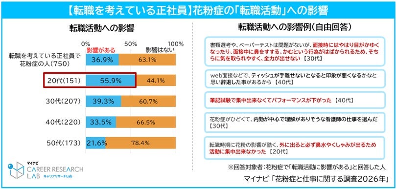 具体的な影響は、「面接時に目がかゆくなる、面接中に鼻をすする、かむという行為に気を取られやすく全力が出せない」「筆記試験で集中できなくてパフォーマンスが下がった」といった声が挙がり、「花粉症」が転職活動の妨げになっている様子がうかがえる。