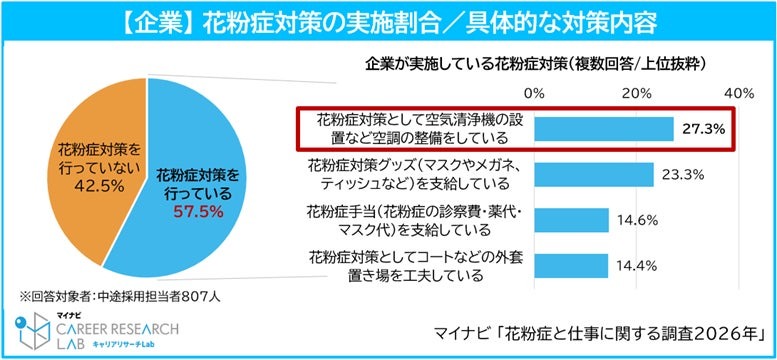 企業の中途採用担当者に花粉症対策の取り組み状況を聞いたところ、花粉症対策を実施している企業は57.5%で、半数以上の企業が「花粉症」に何かしらの対策をとっており、労働環境において無視できない課題として認識されていると同社は推察。