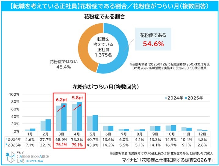 ■転職を考えている正社員の54.6%が「花粉症」、特に辛いのは3月と4月で前年結果よりも約6pt増。アルバイト探しをしている人の「花粉症」割合は47.5%