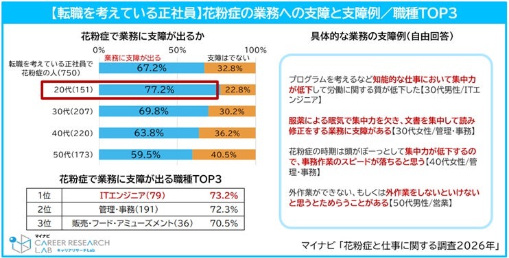 転職を考えている正社員のうち「花粉症」であると回答した人に、「花粉症で業務に支障が出る」か聞いたところ、全体の67.2%が支障が出ると回答。年代別では20代(77.2%)が最多となり、「花粉症」が転職活動に影響する割合と同様に、若年層ほど「花粉症」が業務に支障を与えている傾向がみられた。