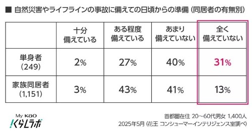 また20~60代を「単身者」と「家族と同居している人」で比較すると、「全く備えていない」割合は、「家族同居者」の13%に対して、「単身者」では31%と、「単身者」の備え不足が顕著に。
