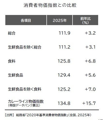 帝国データバンク『2025年のカレー物価1食349円 10年で4割アップ 記録的「カレーショック」の1年に 2026年も値下げ期待薄、高値続く見通し』