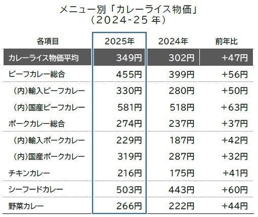 カレーライス1食あたりに必要な原材料費や水道光熱費を基に算出したもので、2025年のカレーライス物価(平均)は1食あたり349円となり、前年の302円から47円、率にして15.6%上昇。