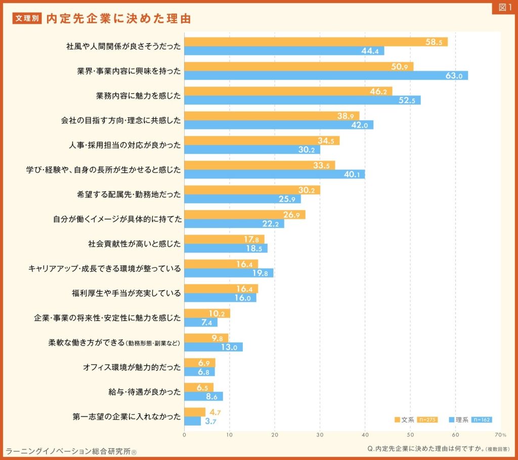 1.内定先企業に決めた理由、文系は「社風や人間関係」、理系は「業界・事業内容への興味」がトップ