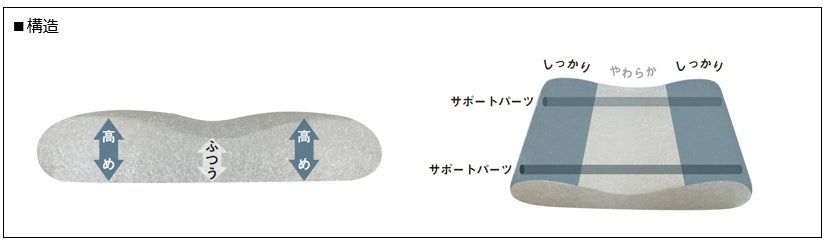 中央部分はサイドに比べて低めでやわらかい感触にし、仰向け寝の際に首が自然な角度になるように設計。横向き寝の時には、首から背骨までが真っすぐの姿勢になり、肩が圧迫されないことが望ましいと言われていることから、両サイドは高さとかたさを出したとのことだ。