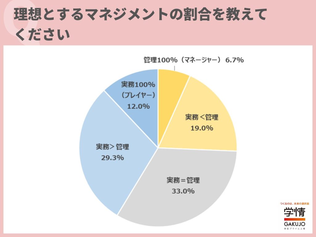 理想とする実務とマネジメントの割合を問う質問では、「実務=管理」が33.0%で最多。続いて、実務重視の「実務>管理」29.3%、管理重視の「実務<管理」19.0%、「実務100%(プレイヤー)」12.0%、「管理100%(マネージャー)」6.7%の順となった。管理より実務を担いたい人が4割を超える結果に。