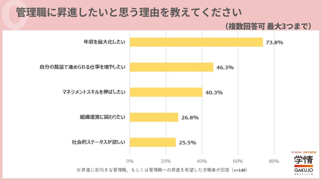 管理職への昇進を希望する人とすでに管理職に就いている人にその理由を尋ねると(3つまで選択)、「年収を最大化したい」が73.8%で突出。次いで「自分の裁量で進められる仕事を増やしたい」46.3%、「マネジメントスキルを伸ばしたい」40.3%と続く。