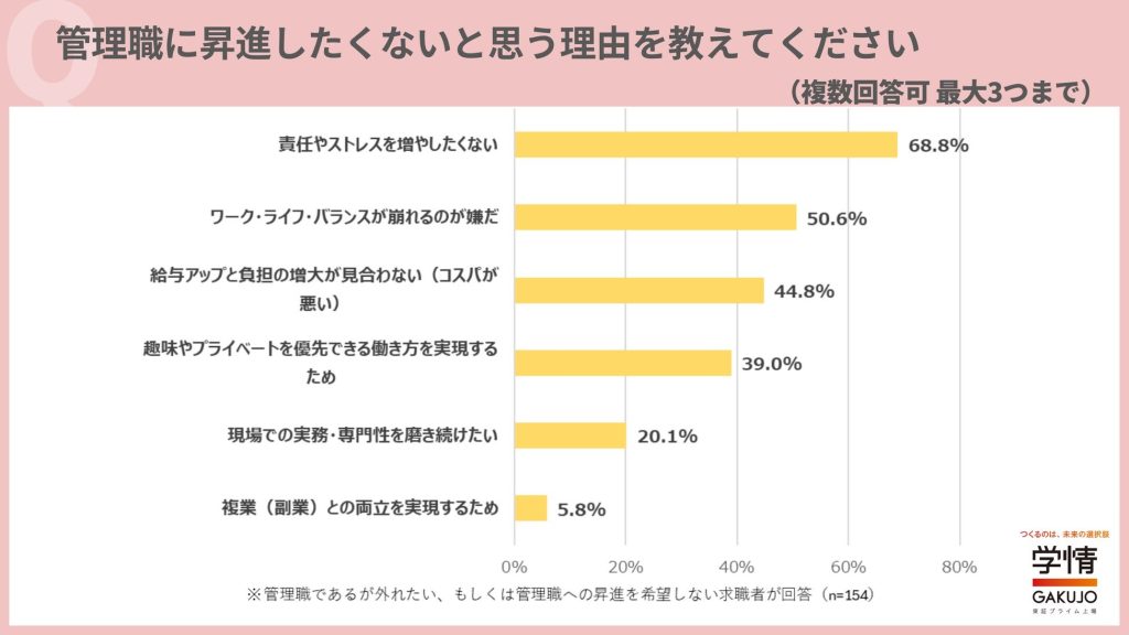 管理職に昇進したくない人にその理由を尋ねると(3つまで選択)、「責任やストレスを増やしたくない」が68.8%と7割近くを占める結果に。