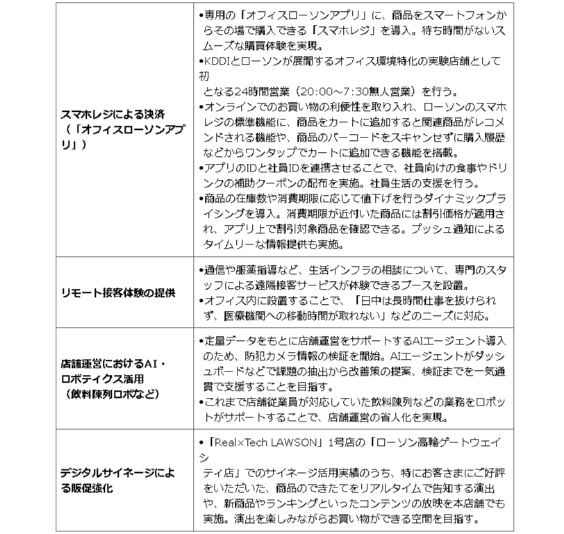 同店舗は、東京・高輪のKDDI本社の「ローソン S KDDI高輪本社店」、KDDI大阪第2ビルの「ローソンKDDI大阪第2ビル店」に続き、オフィス環境に特化した「Real×Tech LAWSON」実験店舗の3店舗目となっている。
