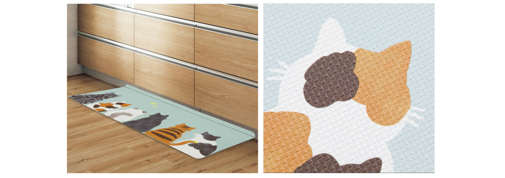キッチンは水はねや油汚れ、食材くずが発生しやすい場所であり、デザイン性だけでなく“掃除のしやすさ”も重要だという。そこで、猫柄のデザインに加え、汚れがたまりにくい構造や日常の手入れ負担を軽減する仕様を両立させたキッチンマットを開発したとのことだ。