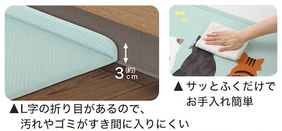 具体的には、高さ約3cmのL字の折り目を設けることで、キッチンマットと床のすき間に汚れやゴミが入りにくい構造となっている。これにより、マット表面を拭き取るだけで手入れしやすい設計であるとしている。