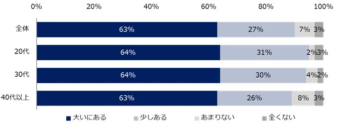 調査の結果、転職活動をする上で不安があるかを尋ねたところ、「大いにある」が63%、「少しある」が27%となり、計90%が不安を抱えていることが分かった。年代別では、20代が計95%(大いにある:64%、少しある:31%)で最多となった一方、30代は94%(大いにある:64%、少しある:30%)、40代以上は89%(大いにある:63%、少しある:26%)となり、年代による大きな差は見られなかった。
