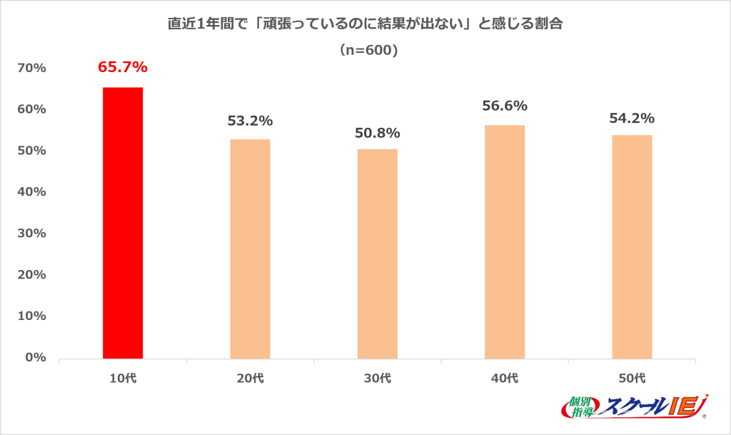 調査対象者全員に、「直近1年で『頑張っているのに結果が出ない』と感じたことはあるか」と質問したところ、全体の54.9%は「頑張っているのに成果が出ない」と感じており、特に10代では65.7%と、他の世代よりも高い傾向となった。