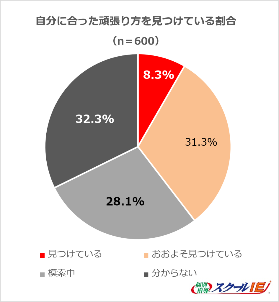 その一方で、実際にそれを見つけられていると答えた人はわずか8.3%にとどまった。約6割(60.4%)が「模索中(28.1%)」「分からない(32.3%)」と回答しており、多くの人が自分に合った努力をまだ見つけられていない、“努力迷子”であることが分かった。