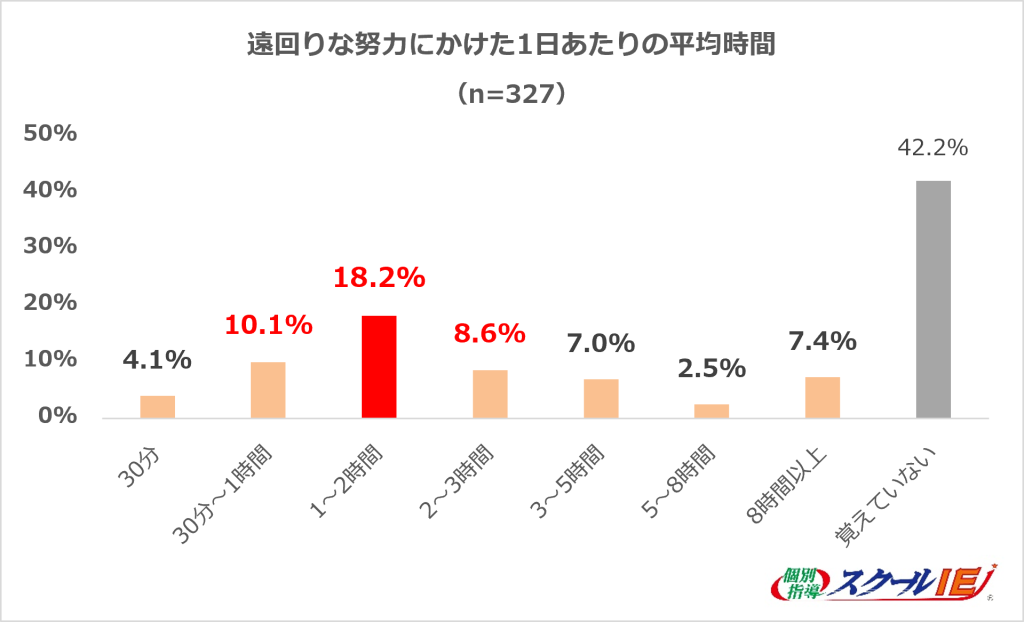 期間中に1日あたり費やしていた時間としては、「1~2時間(18.2%)」「30分~1時間(10.1%)」「2~3時間(8.6%)」が上位を占める結果に。仮に、毎日2時間×1年間取り組んだ場合、累計730時間(約30日分)は、遠回りな努力に時間を費やしていたことが明らかになった。