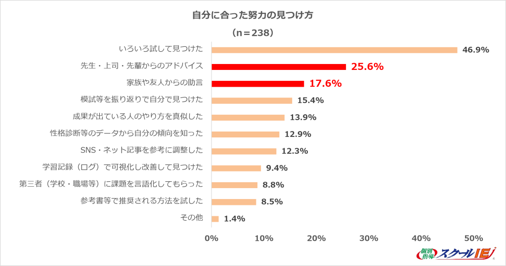 自分に合った努力の仕方を「見つけている」「おおよそ見つけている」と回答した人に対して、その見つけ方を聞いたところ、「いろいろ試して見つけた(46.9%)」が最も多く、次いで「先生・上司・先輩からのアドバイス(25.6%)」、「家族・友人からの助言(17.6%)」が続き、自分に合った努力は、試行錯誤や周囲からのサポートによって見つけていることが分かった。