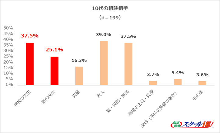 また、周囲に相談する人に対して、相談相手について聞いたところ、「友人(40.0%)」、「親・きょうだい(32.9%)」と身近な人へ相談する傾向があることがうかがえる。10代の相談相手としては、「友人(39.0%)」、「親・きょうだい(37.5%)」、「学校の先生(37.5%)」、「塾の先生(25.1%)」があげられ、友人・家族だけでなく、学校・塾の先生も身近な相談相手であることが分かった。