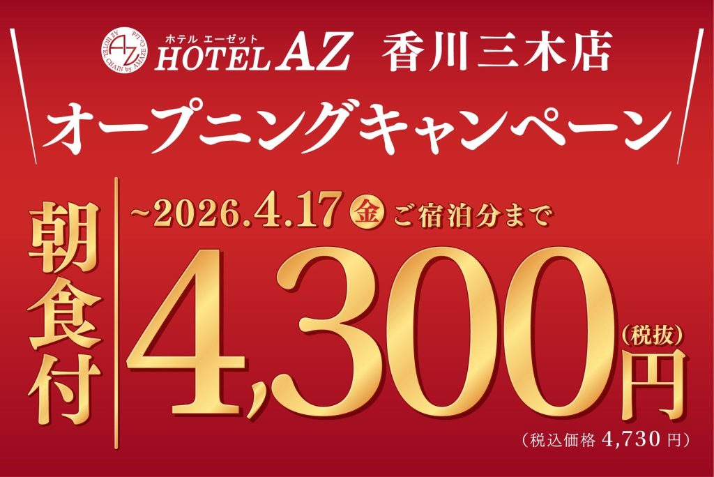 香川県・三木町に「HOTEL AZ 香川三木店」が3月18日オープン 宿泊料金1,500円オフのキャンペーンを開催