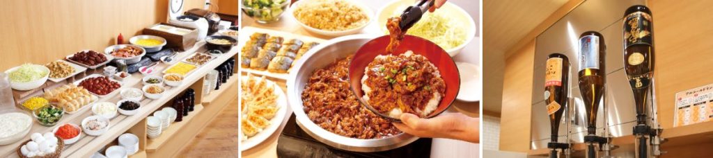 館内にはレストランを併設し、宿泊者は無料の朝食バイキングを利用可能。夕食バイキングの提供や、別料金でアルコール飲み放題サービスも用意するという。