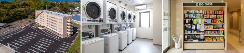 設備面では、無料の平面駐車場220台分を完備するほか、全館で無料Wi-Fiを提供。コインランドリーや100円ショップも設置し、連泊や長期滞在にも対応できる環境を整備するとしている。