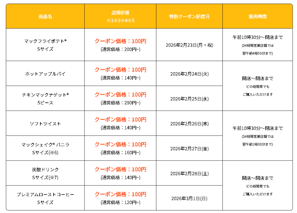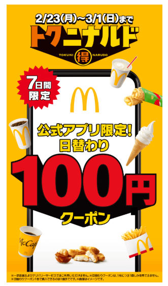 2026年の第一弾となる「トクニナルド」キャンペーンでは、マクドナルドの公式アプリで日替わり「100円クーポン」を2月23日から3月1日までの7日間限定で配信。