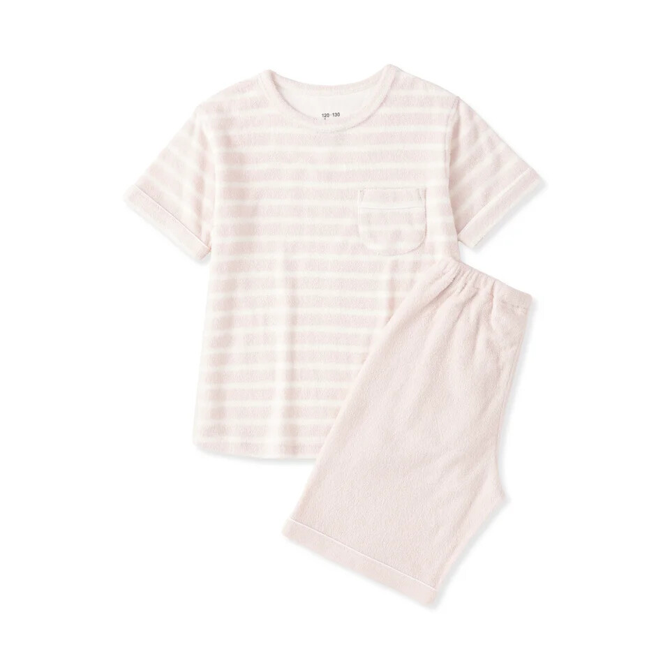 ・キッズ 着るタオル 両面パイル 半袖ルームウェアセット:3,990円(サイズ:120〜130、140〜150/カラー:スモーキーピンクボーダー、スモーキーブルーボーダー)