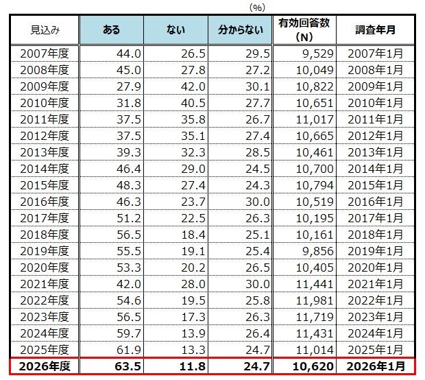 2026年度の企業の賃金動向について尋ねたところ、正社員の賃金改善(ベースアップや賞与、一時金の引き上げ)が「ある」と見込む企業は63.5%となった。5年連続で前の年を上回り、2年連続で6割台となり、過去最高を更新。