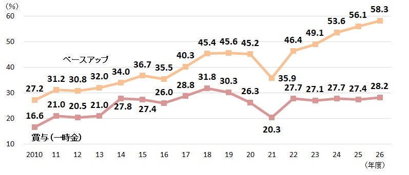 賃金改善の具体的な内容についてみると、「ベースアップ」が58.3%(前回調査比2.2ポイント増)、「賞与(一時金)」が28.2%(同0.8ポイント増)となった。「ベースアップ」は、過去最高となった前年の56.1%を上回り、5年連続で最高を更新。