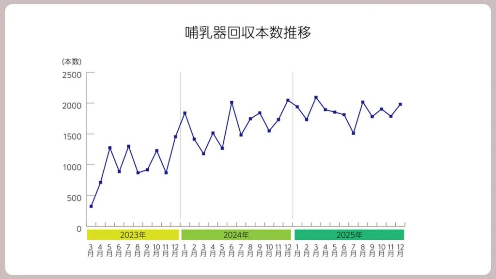 現在は全国で1カ月あたり約2,000本の哺乳器を回収しており、回収本数は年々増加しているという。回収ボックスは、全国のアカチャンホンポ130店舗に設置されている(2026年1月末時点)。