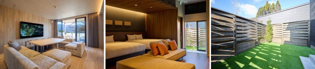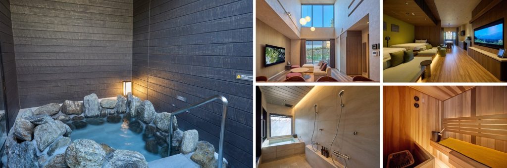 客室は、定員4~6名の平屋タイプと、定員8~10名の2階建てメゾネットタイプを用意。全20室のうち17室は1棟貸し切り型で、全室に自家源泉の温泉風呂とサウナ、テラス、キッチンを備えるとのことだ。