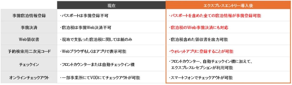 利用者は、ホテル到着前にアプリまたはWebブラウザの「エクスプレスエントリー」画面から必要事項を登録し、チェックイン用二次元コード「エクスプレスパス」を発行できる。「エクスプレスパス」はアプリ表示に加え、スマートフォンのウォレットアプリに保存可能。