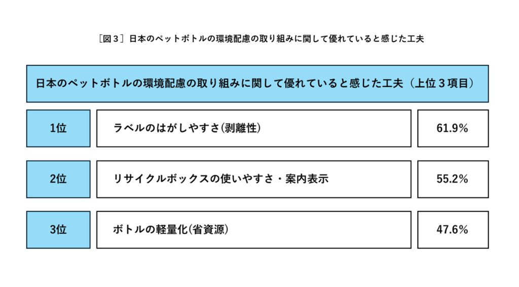 また、2位は「リサイクルボックスの使いやすさ・案内表示」(55.2%)、3位は「ボトルの軽量化(省資源)」(47.6%)という結果になり、訪日外国人の視点から見て、多様な工夫が評価されていることがうかがえる。