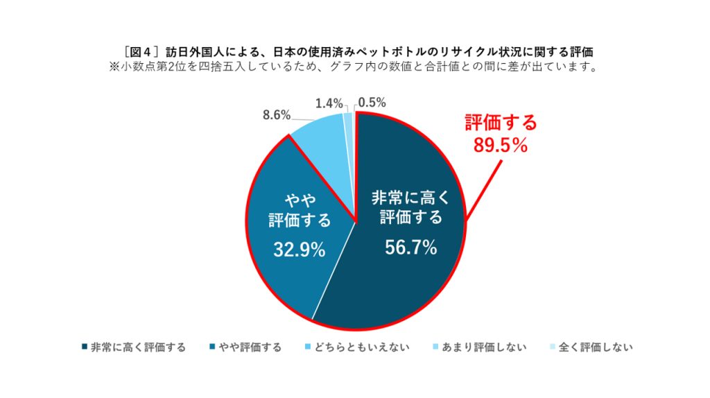 調査実施時、日本の「使用済みペットボトルの約9割が何らかの用途にリサイクルされ、約4割が新しいペットボトルに再生(水平リサイクル)されている」ことに対し、訪日外国人の89.5%が「評価する」と回答。