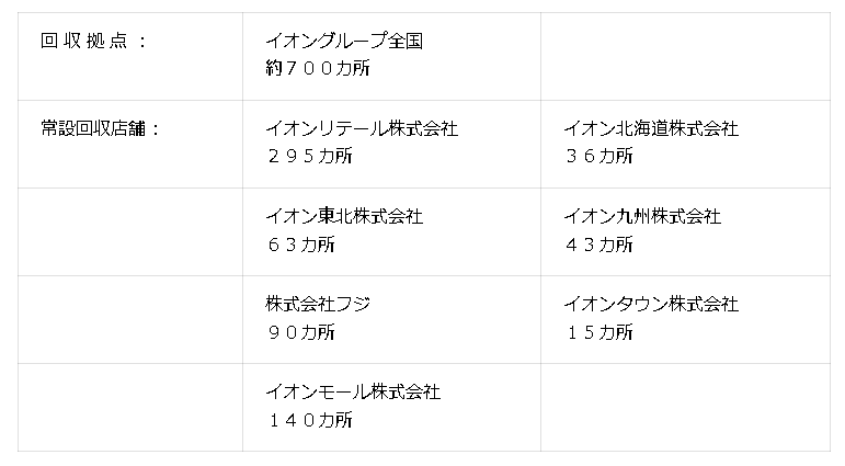 同社は今回、イオングループとして常設している資源回収ボックスをイオンリテールで251カ所増設し、既に常設回収を実施している各社・施設と合わせ、イオングループ全国約700カ所に常設設置。