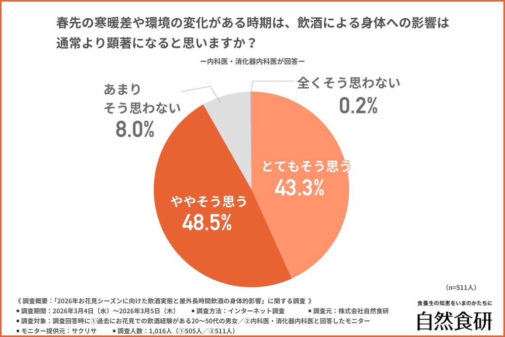 その結果、9割以上が「とてもそう思う(43.3%)」「ややそう思う(48.5%)」回答し、医師のほとんどが、春先特有の寒暖差や環境変化が飲酒によるダメージをより顕著にすると考えていることが示された。