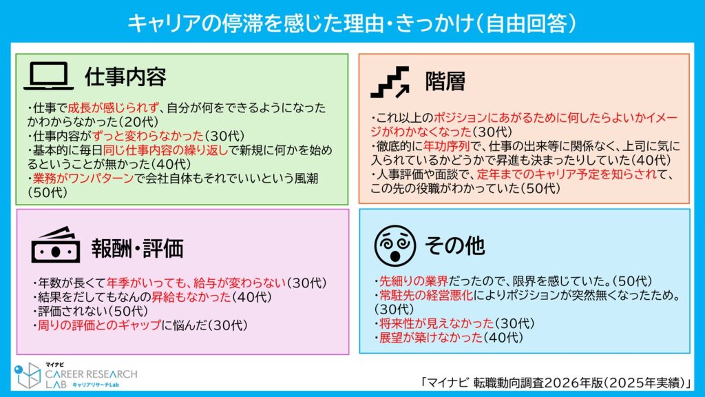 キャリアの停滞感を感じていたきっかけをみると、「毎日同じ仕事内容の繰り返し(40代)」、「周りの評価とのギャップに悩んだ(30代)」、「定年までのキャリア予定を知らされて、この先の役職がわかっていた(50代)」、「将来性が見えなかった(30代)」など、「仕事内容」「階層」「報酬・評価」に関する回答が目立った。