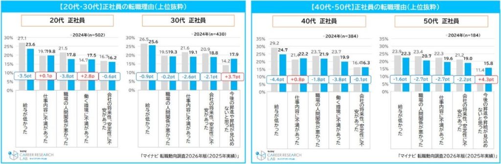 ■転職理由は「給与が低かった」が最多。30・50代では「今後の昇進や昇給が見込めないと思った」が前年比より約4pt増加