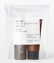 あわせて発売する「無印良品 精油の香り シャンプー&コンディショナー お試しセット ひのき&ラベンダーの香り」(税込1,089円)は、無印良品の「精油の香りシリーズ」として初の携帯用ミニサイズのシャンプーとコンディショナーを、持ち運びに便利なケースに入れたセットであるとしている。
