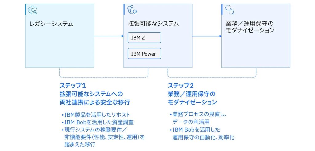 「AI×モダナイゼーション」では、IBM Z、IBM PowerおよびAIエージェント駆動のエンタープライズ向け開発パートナー「IBM Bob」を活用し、現行システムの安全な移行を推進するという。移行後は、watsonxやIBM Bobを活用し、業務プロセスの見直しとデータ活用、運用保守の自動化・効率化を目指したモダナイゼーションの実現に取り組むとしている。