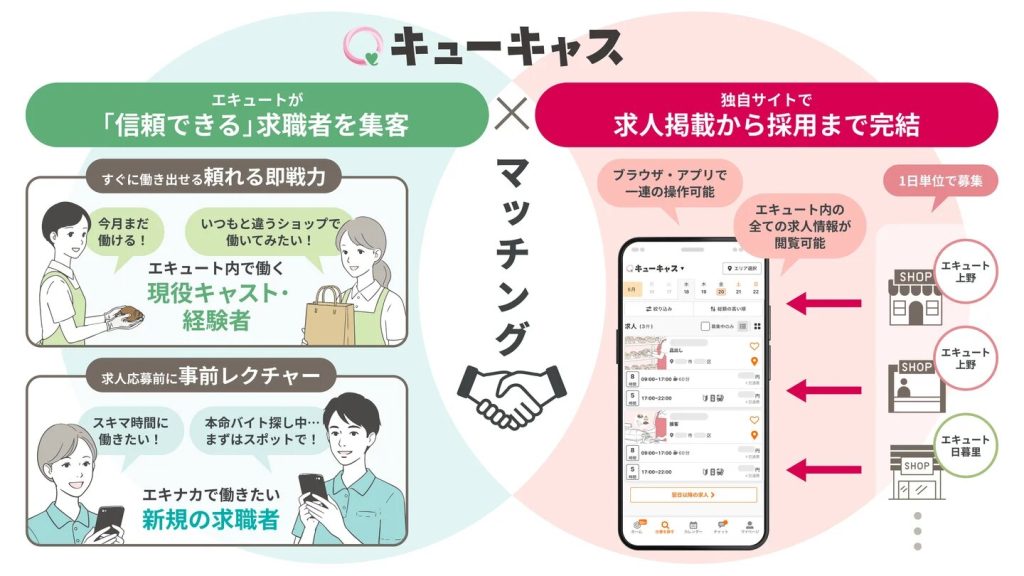 エキュート、新スポットワークサービス「キューキャス」の実証実験を開始 上野駅と日暮里駅で人材確保モデルを検証