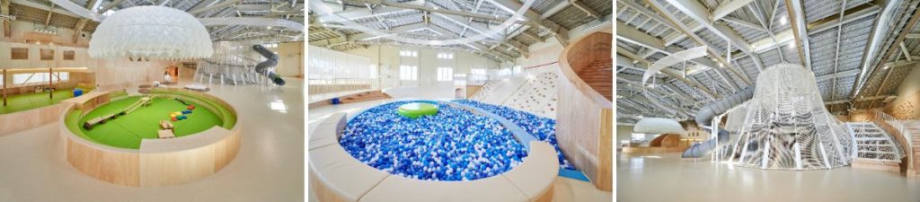 施設の遊び空間は、建築全体を一体的な遊具と捉えた立体的な構成を採用。館内は坂井市の地形をモチーフに、「日本海」「坂井平野」「竹田の山」を表現したエリアで構成されているとのことだ。