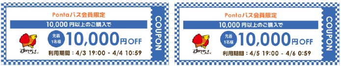 さらに、Pontaパス会員限定で、10,000円以上の購入時に利用できる10,000円オフクーポンを配布するとのことだ。各日先着1名が利用できるとしている。